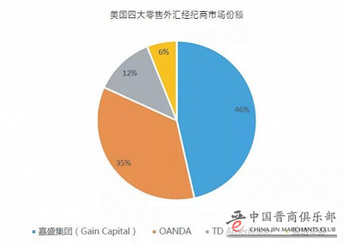 从CFTC每月公布的市场份额数据来看,全美零售外汇行业领头羊嘉盛集团(Gain Capital)继续保持领先地位,市占率为46%。OANDA继续巩固其全美第二大市场份额35%;之后是TD Ameritrade和盈透证券,市占率分别为12%及6%。