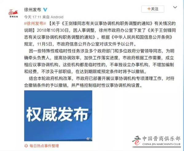 1月12日,徐州市人民政府新闻办公室官方微博 @徐州发布 发布了关于《王剑锋同志有关议事协调机构职务调整的通知》有关情况的说明。