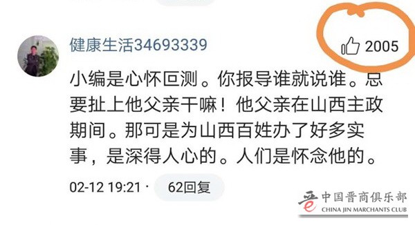 此文一出,迅速引来了大量评论,晋商俱乐部注意到这些评论中大部分内容聚焦在“谈胡志强的事情就谈胡志强的事情,不要牵涉其父亲也就是山西省委原书记胡富国”。