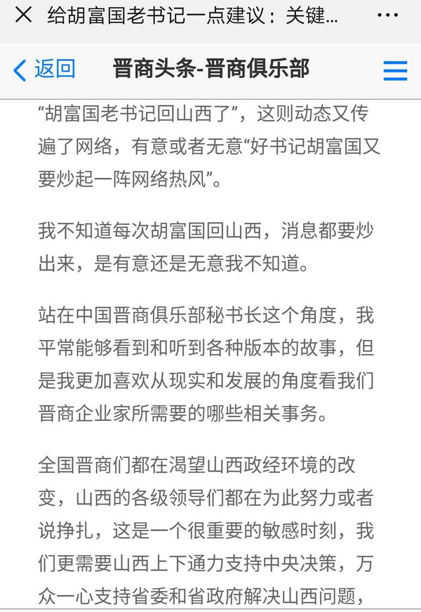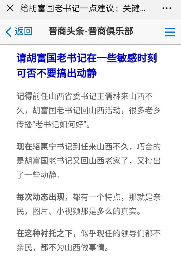 如2016年8月22日晋商俱乐部发布了一篇建议“给胡富国老书记一点建议:关键时刻用有所不为支持山西”,建议中提到“记得前任山西省委书记王儒林来山西不久,胡富国老书记回山西活动,很多老乡传播“老书记如何好”;现在骆惠宁书记到任来山西不久,巧合的是胡富国老书记又回山西老家了,又搞出了一些动静。”