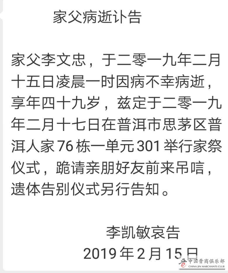 今天惊闻,中国晋商俱乐部联合发起机构普洱市山西商会会长李文忠会长于昨晚(2月14日晚,2月15日凌晨1时)因高血压引起脑溢血,抢救无效不幸英年早逝。