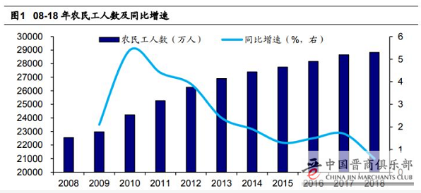 统计局数据显示,中国农民工总量自2016年以来已突破2.8亿人,2018年农民工总数2.88 亿人,约占中国总人口的21%。不过,近年来农民工人数的增长陷入停滞,2014年开始农民工人数同比增速就已降至2%以下,2018年增速更是不足1%,2018年农民工人数比2017年仅增加180万人左右,双双创下2009年以来的历史新低。