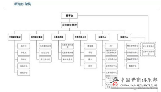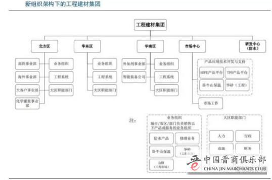 据相关资料了解到,此次东方雨虹的组织架构变革是其公司业务板块的划分和销售渠道的调整。业务板块划分方面,原“1+6”事业群调整为工程建材集团、民用建材集团、天鼎丰控股、投资控股公司(新市场培育),并设立制造中心和职能中心,共 6 大板块。相对于“1+6”的架构,民用建材、非织造布板块基本没有变化,建筑涂料板块部分业务和其他投资收购项目被并入投资控股公司,节能保温、特种砂浆、建筑修缮、装饰涂料等板块的 B 端业务与原有的建筑防水板块的 B 端业务一起并入工程建材板块。此外,单独设立的制造中心和职能中心则是将生产、物流、财务、数据等各项业务进行统一管理,在过去各个板块各自管理的基础上进行了精简,分工更加明细了,这进一步提升了效率。