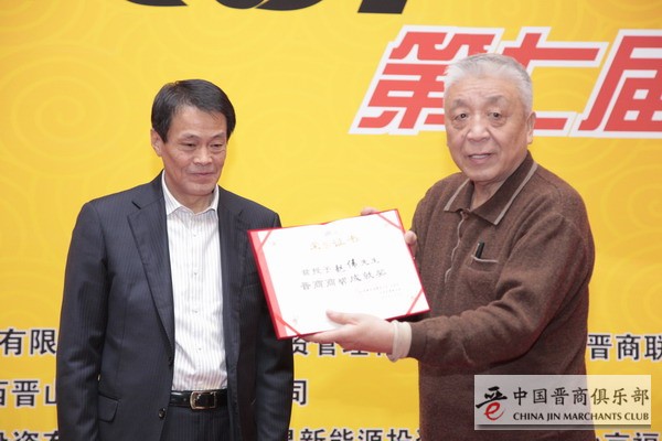 作为本次晋商年会的特殊荣誉,主办单位中国晋商俱乐部授予天津市山西商会会长张世伦晋商商帮终身成就奖、授予河南省晋商会荣誉会长赵伟晋商商帮成就奖,并且特别邀请山西省原政协副主席、民进山西省委原主委、知名晋商研究专家张正明先生为张世伦和赵伟两位获奖者颁发了荣誉证书。