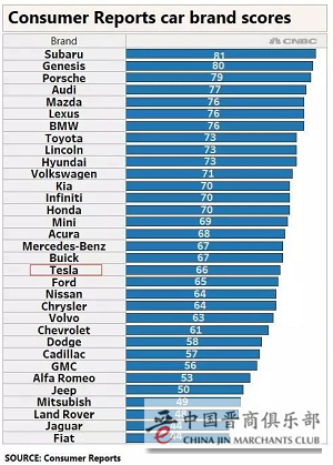 不仅如此,从整个品牌来看,特斯拉在《消费者报告》列出的33个品牌中下滑11位,跌至第19位。