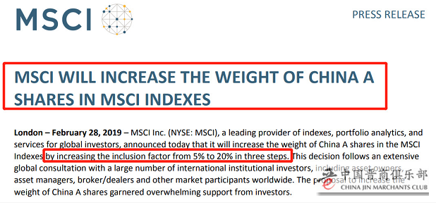 MSCI发布公告称,将扩大中国A股在MSCI全球基准指数中的纳入因子至20%(当前为5%),这将分三步实施: