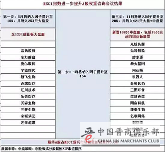 MSCI表示,完成三步实施后,MSCI新兴市场指数的预计成分股中有253只中国大盘A股和168只中国中盘A股(其中包括了27只创业板股票);这些A股在此指数中的预计权重约3.3%。