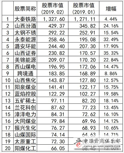 以下为山西辖区A股上市公司2019年2月末市值排名情况: