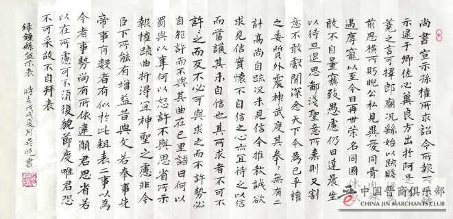 最近,吴晓又在创作《中国县域书画长卷》。《中国县域书画长卷》以省分卷,共300余万字,将是我国历史上首次用书法的形式记载县域历史沿革、历史遗迹、历史名人等珍贵资料,具有一定的史料价值、文化价值、艺术价值。吴晓坦言,创作《中国县域书画长卷》就是为了展示中华民族5000年文明精华,向世界彰显中华民族的文化自信。
