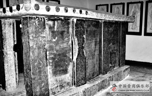 此外,这座石椁也绝非一般,是山西发现的最大的一个,也是代表唐代最高艺术水准的石椁。该石椁由34块青石雕刻组合而成,为一庑殿顶房屋形状,由顶部、中部、底座三部分组成,上面以线刻的方式,精雕细琢了各式图案,以及众多侍女图像,表明薛儆的族人希望借此在他死后也能得享生前的荣华。在张庆捷看来,这件石椁有很重大的价值,第一,它通过艺术手法表现了当时豪门的生活;第二,石椁上线刻的人物栩栩如生、形神兼备,它存在的艺术价值甚至超过了当时唐代传世的一些名画;第三,通过侍女身上的穿着打扮,体现了唐代的开放性,许多衣饰、戴饰、盘囊等都有西方的一些印记,充分表现了当时的盛唐气象。