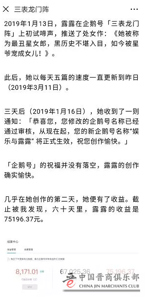 在该文章中,他表示,自己在科技领域写了几年文章,但在“企鹅号”上毫无平台收益,而被盗号者“露露”改成娱乐号之后,生产的内容虽全是一小时能生产五篇的娱乐八卦标题党,但每日收益却少则上千,多则几千。
