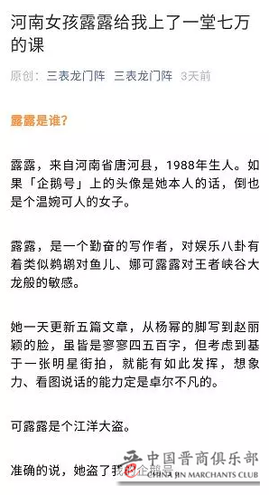 近日,自媒体作者三表发布了一篇题为《河南女孩露露给我上了一堂七万的课》的文章。文章称,他的企鹅号被“露露”盗用两月有余,盗号者用他的账号一天更新五篇文章,60天里收益75196.37元。