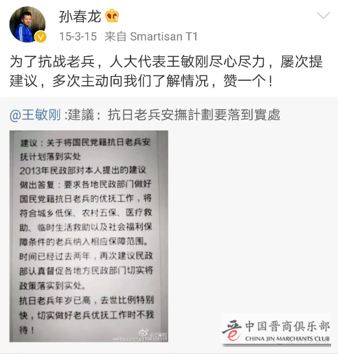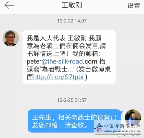 很快,王敏刚先生私信:我是人大代表王敏刚,我愿意为老战士们在两会发言。简单的一句话,能感受到他的责任和担当。