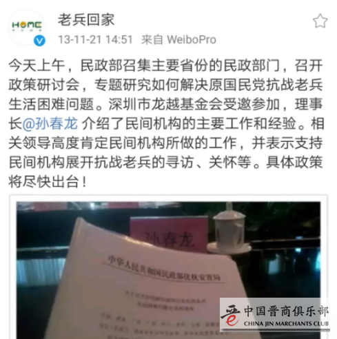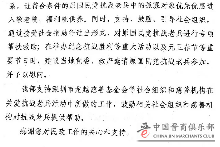 又过了一个多月,7月2日下午,王先生突然在微博上@我,打开看了,我激动地大叫。同事都惊讶地看着我,我有些语无伦次。在微博里,王先生晒出了民政部的回复,对方称,已下发通知,要求各级民政部门做好原国民党抗战老兵的有关工作,支持深圳市龙越慈善基金会等社会组织在关爱抗战老兵活动中所做的工作。
