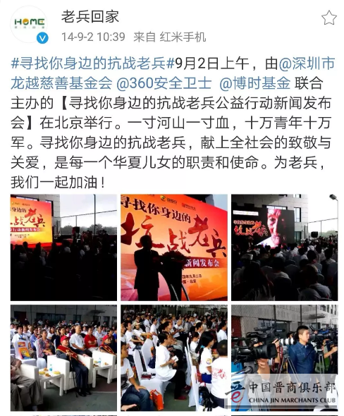 2014年9月2日,360公司、博时基金分别捐赠360万元,联合龙越基金会在北京召开“寻找你身边的抗战老兵”新闻发布会,在全国范围内开始大规模地进行国军抗战老兵的寻访与核实。我为此寻找了国家网信办的老领导,网信办给各大网站发文,要求将这一新闻放在重要位置。那一两天,好多网站的头条新闻是“寻找原国民党抗战老兵”。