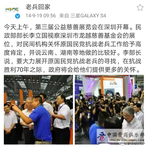 这月19日,全国慈善展览会在深圳召开,时任民政部部长专门来到我们的展位,告诉我,要大力展开抗战老兵的寻找,在老兵的身份认定上,不能太过严格而冤枉了老兵,认定错了,也是照顾了一个老人,但冤枉了,是老兵一生的荣誉。