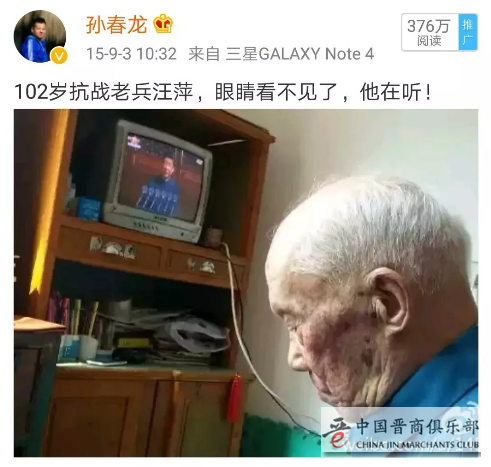 2015年9月3日上午,中国人民抗日战争暨世界反法西斯战争胜利70周年纪念大会在北京天安门广场举行,抗战老兵方阵在摩托车礼宾方队护卫下率先通过天安门,接受检阅。这其中,有30多名国军抗战老兵。国共抗战老兵一起接受检阅的场面,让很多人激动地流下了泪水。