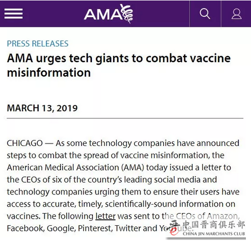 这封信的内容,是向亚马逊、Facebook、谷歌、Pinterest、Twitter和 YouTube 等企业的首席执行官求助,要他们帮忙阻断错误信息的传播,制止国内一场风起云涌的运动——“反疫苗”,称这场运动已经使得部分疾病在美国大幅上升,并对公共健康构成威胁。
