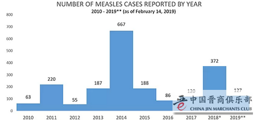 这其实并不是一个“意外”。不仅在华盛顿州,今年以来,全美已在10个州确诊超过120例麻疹病例,其中大多数是儿童。实打实的数据也显示,从2018年起,美国的麻疹病发就呈现明显的“高爆”期。