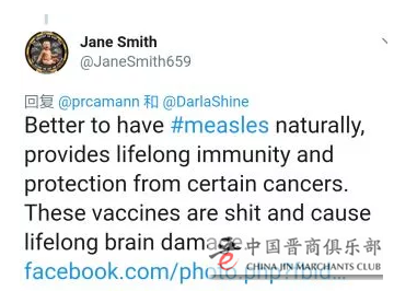 “最好要自然地患上麻疹,这样能帮助你终生免疫并预防某些特定的癌症。这些疫苗就是屎,还会带来永久性脑损伤。”