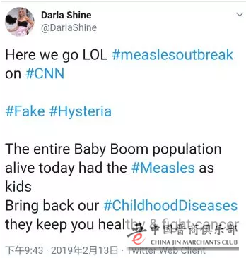 美国著名作家达拉·夏因(Darla shine)不久前在推特上发布了关于反疫苗的惊人之语,她表示麻疹会让人身体更健康。