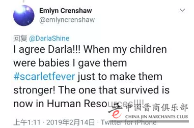“我同意!当我的孩子们还是婴儿的时候,我让他们感染了猩红热,使得他们变得更健康了,其中一个孩子现在还在做人力资源的工作呢。”