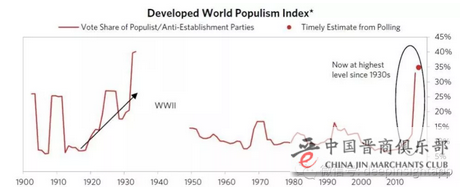 (图为发达国家民粹主义指数,可见从2010年后开始爆炸式增长,几乎达到了二战前法西斯主义盛行时期的水平 来源:桥水基金报告 2017.3)