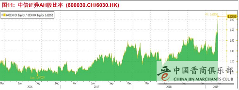 其中中信证券 A 的股价较其 H 股股价高出 63%,较三年平均值高 4.4 个标准差。