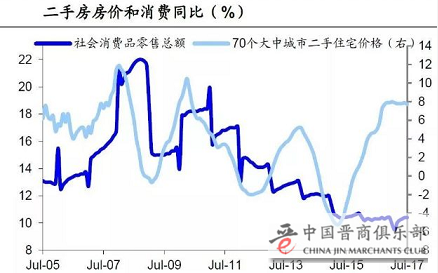 尤其到11年以后,房价与全社会消费增速的之间的相关几乎消失,12年和16年两个地产销售和房价大幅上涨的时期,社会消费品零售总额增速反而维持震荡走弱的表现。