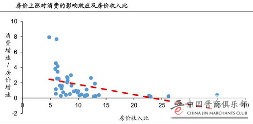 实际上这取决于房价收入比,海通对包含一二三线的45个城市的数据进行分析,结果发现房价收入比较高的城市,房价上涨1%只会带来消费增速上涨0.2%;而对房价收入比较低的城市,其房价上涨1%会带来7.9%的消费增速。