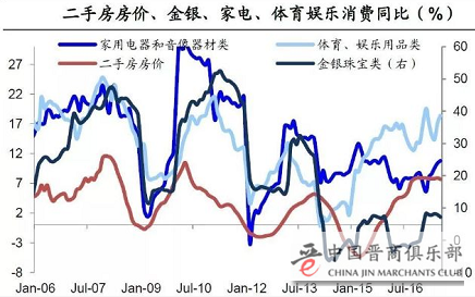 海通研究显示,00年以来,房价经历了四次快速上涨,都导致了家电、金银珠宝和体育娱乐用品等可选消费的快速增加。16年房价飙升,带动家电消费增速接近15%,体育娱乐用品增速超过20%。