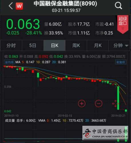 21日,港股中国融保金融集团复牌交易。没想到,复牌后的股价继续暴跌。早盘该股股价就急速跳水,跌幅一度下探52.27%。截至收盘,股价报收0.063港元,跌幅为28.41%。
