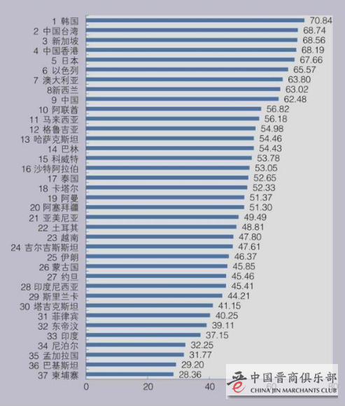 日本、以色列、澳大利亚、新西兰、中国、阿联酋分列第5-10位,中国仍保持上年度第9位的排名。