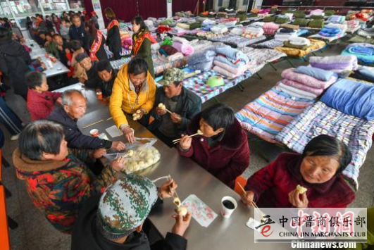图为转移安置群众在安置点吃午饭。 武俊杰 摄
