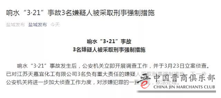 响水“3·21”事故发生后,公安机关立即开展调查工作,并于3月23日立案侦查。已对江苏天嘉宜化工有限公司3名负有重大责任的嫌疑人采取刑事强制措施。下一步,公安机关将进一步加大侦查工作力度,对涉嫌犯罪的一查到底,依法处理。