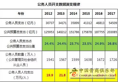 2017年,我国的公务员占公共预算支出的比值已经高达了26.8%,公务人员的人均支出,从2012年的19.9万元,到了2017年已经达到了31.6,万,累计增长幅度高达58.8%。