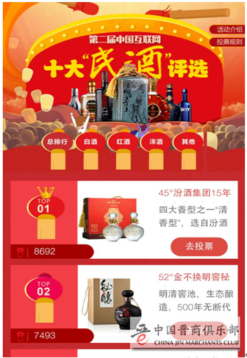 近日,由酒仙网商学院主办的“第二届中国互联网十大‘民酒’评选活动”五十强名单震撼出炉,45°汾酒集团15年陈酿(千秋爵品老酒)、法国原瓶进口AOC勆迪干红葡萄酒、人头马CLUB特优香槟干邑等39款白酒、9款红酒、2款洋酒成功晋级。而“50晋10”线上投票也已于日前正式开放投票渠道,只要关注微信服务号“酒仙网” (jiuxianweixin),即可参与十大“民酒”评选。