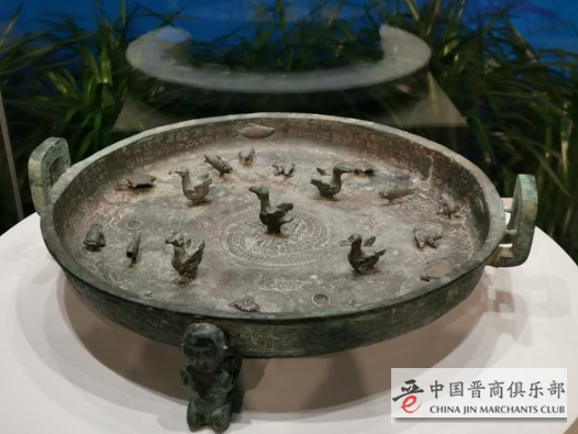 春秋时期晋公盘,盘内底有水鸟、鱼、龟、蛙等动物,动物能在原处转动,是晋公为其长女孟姬出嫁时所作。