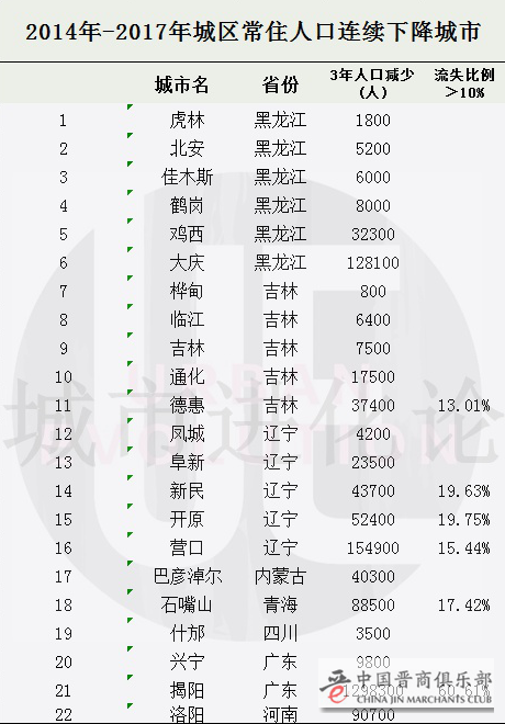 单纯以2014年-2017年间城区常住人口的变化情况来看,666个城市中有22个城市呈现出连续三年下降的情况。