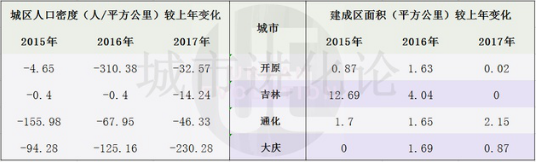 只有位于东三省的12座“收缩型城市”,同步伴随着人口密度连续三年下降。辽宁营口尤其突出,2014年-2017年间,每平方公里土地上的人口减少了约3884人,黑龙江佳木斯紧随其后,三年人口密度减少3047人/km。