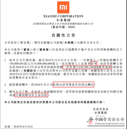 继昨天确认“百亿薪酬员工”为董事长雷军后,今天(4月10日)上午6点,小米集团在港交所发布“自愿性公告”(下称:公告)称,截至2018年12月31日止年度,雷军所获的薪酬介于1.5亿-150亿港元。