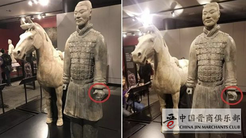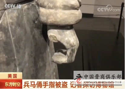 2017年9月,“兵马俑:秦始皇帝的永恒守卫”展在美国费城富兰克林科学博物馆正式开幕,展览至2018年3月结束。2018年2月,媒体惊曝展览中一件兵马俑的拇指被人掰下盗走,该博物馆直到两周后才发现这一情况。警方通过监控录像找到了嫌犯——24岁的美国男子迈克尔⋅罗哈纳,并追回被掰下的手指。