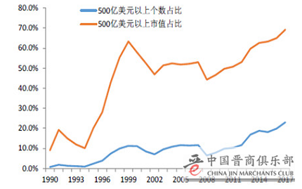 从1997年至2017年,美国市值超过500亿美元以上的公司市值占比从原先的10%上升到了近70%,而且这些公司的数量占比从过去的1%左右,提高到了20%以上。
