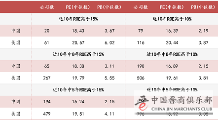 比较中美股市过去10年中ROE有5年在10%以上的公司估值水平,发现国内约有504家符合条件,其市盈率中位数16.33,低于美国符合该条件上市公司的18.92。说明A股中业绩相对好的公司的估值水平比美国类似公司仍要低。