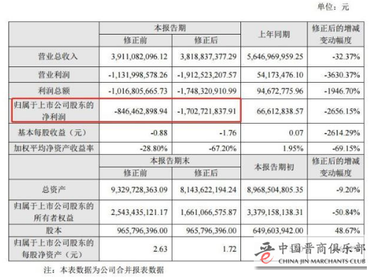 业绩修正主要原因为:调整计提商誉减值准备,计提商誉减值增加4.8亿元;补提了存货跌价准备2.39亿元;将业绩快报时已确认的递延所得税资产1.26亿元冲回。