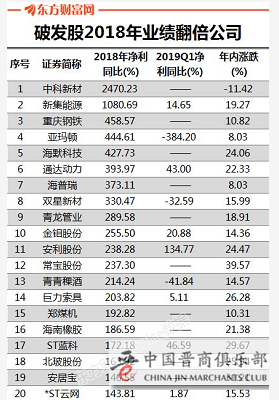 当前,正是2018年报和2019一季报披露高发期,对264家破发股来说,其中238家公司已披露2018年报或快报,有112家公司业绩同比上涨,其中39家业绩翻倍,中科新材和新集能源更是增超10倍,同比涨幅分别是2470.23%和1080.69%。