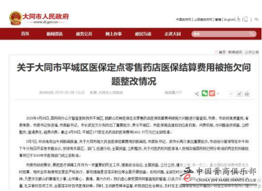 近日,国务院办公厅“互联网+督查”平台曝光:山西省大同市市区两级医保机构互相推诿,拖欠千余万元医保费用,导致该市平城区100多家药店流动资金枯竭,面临倒闭。除拖欠医保费用外,截至2019年4月,大同市医保中心仍在变相实施国务院已明令取消的“两定机构审查”审批事项(基本医疗保险定点零售药店资格审查和基本医疗保险定点医疗机构资格审查)。
