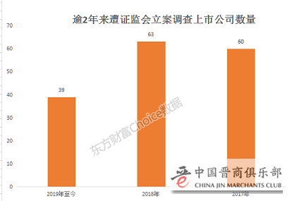 不完全统计显示,2019年至今还未过半,已经有39家上市公司或相关人员被证监会立案调查;而2018年和2017年全年这一数字分别为63家和60家。