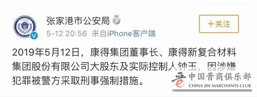 “张家港市公安局”此前发布消息称,2019年5月12日,康得集团董事长、康得新复合材料集团股份有限公司大股东及实际控制人钟玉,因涉嫌犯罪被警方采取刑事强制措施。