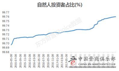 而自中证登披露有关数据以来,我国自然人投资者一直维持在很高的水平,且所占比重在不断增加,由2015年5月初的99.7%增加到目前的99.76%。